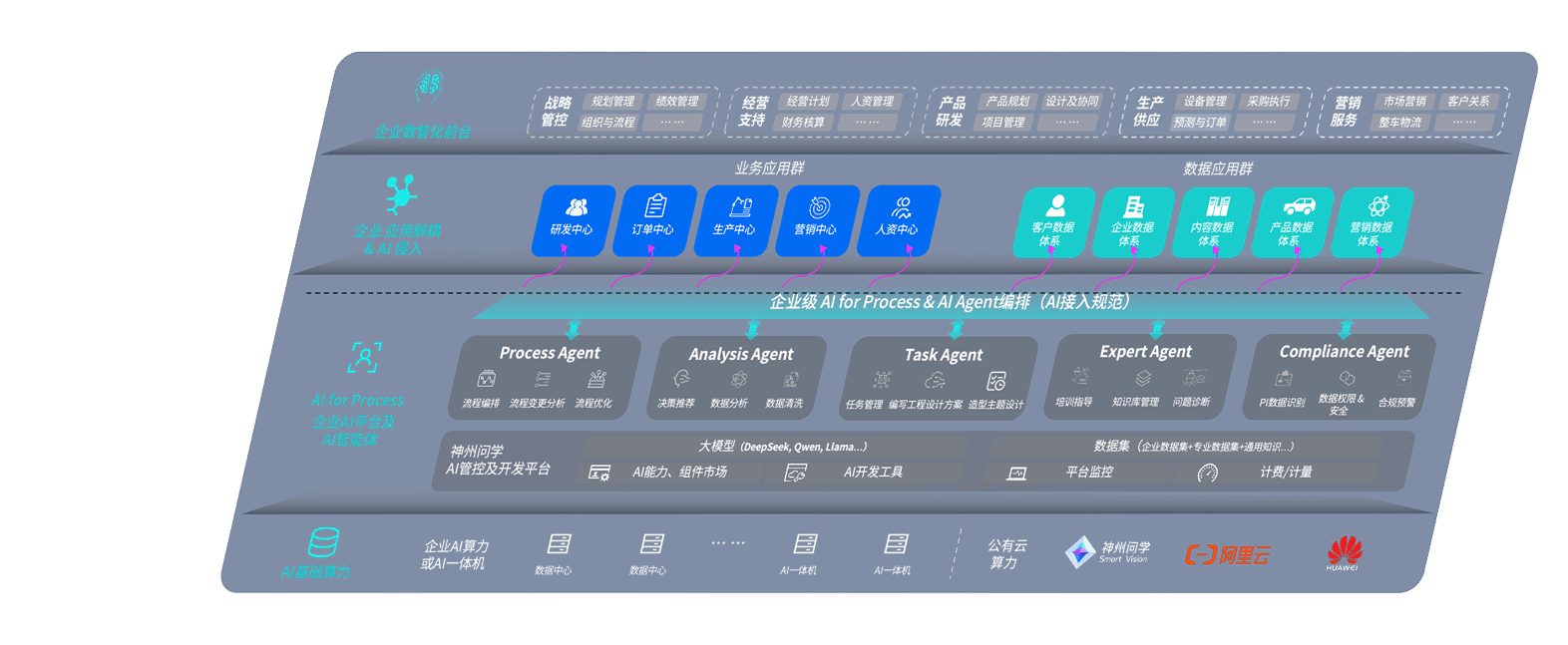 端到端的一站式AI工作空间深度融合了从企业战略规划到日常经营的全流程业务板块,,,,定向解决车企内部领域多、、部门多、、链条长、、场景碎片化等难题,,支持车企快速构建以AI为核心的生产力写作体系,,,实现任务执行与AI能力的无缝集成与交互